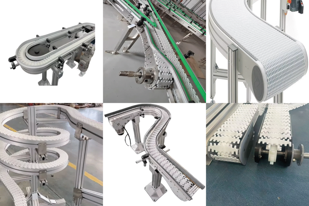 a. Flat flexible chain conveyor: focusing on material transportation within a single plane, it can achieve flat trajectory operation such as straight lines and turns, and is suitable for horizontal material transportation, sorting and other scenarios.