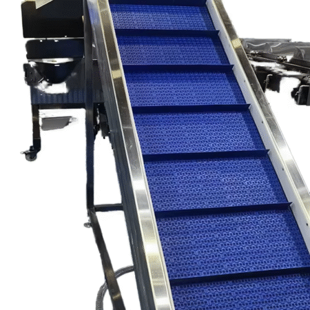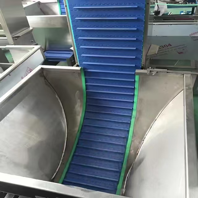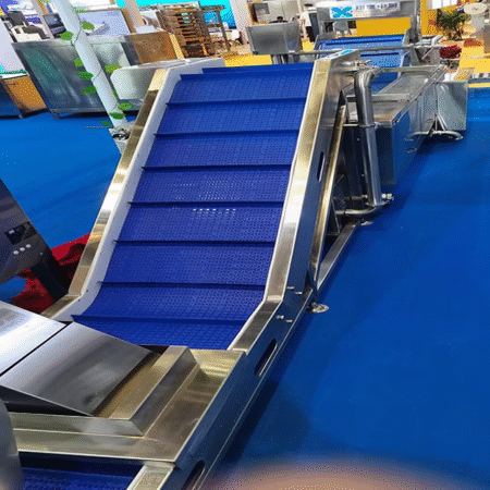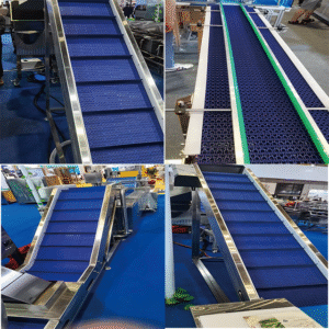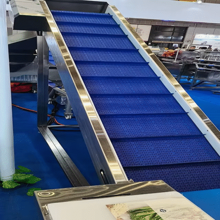 This conveyor belt equipment features a stainless – steel frame, which is sturdy, durable, and easy to clean. It is suitable for various industries such as food and chemical industries. The blue mesh belt is breathable and less likely to stick to materials, effectively preventing blockages. The inclined conveying angle can be flexibly adjusted to meet different conveying requirements, significantly enhancing the material flow efficiency in the production process.