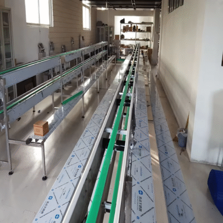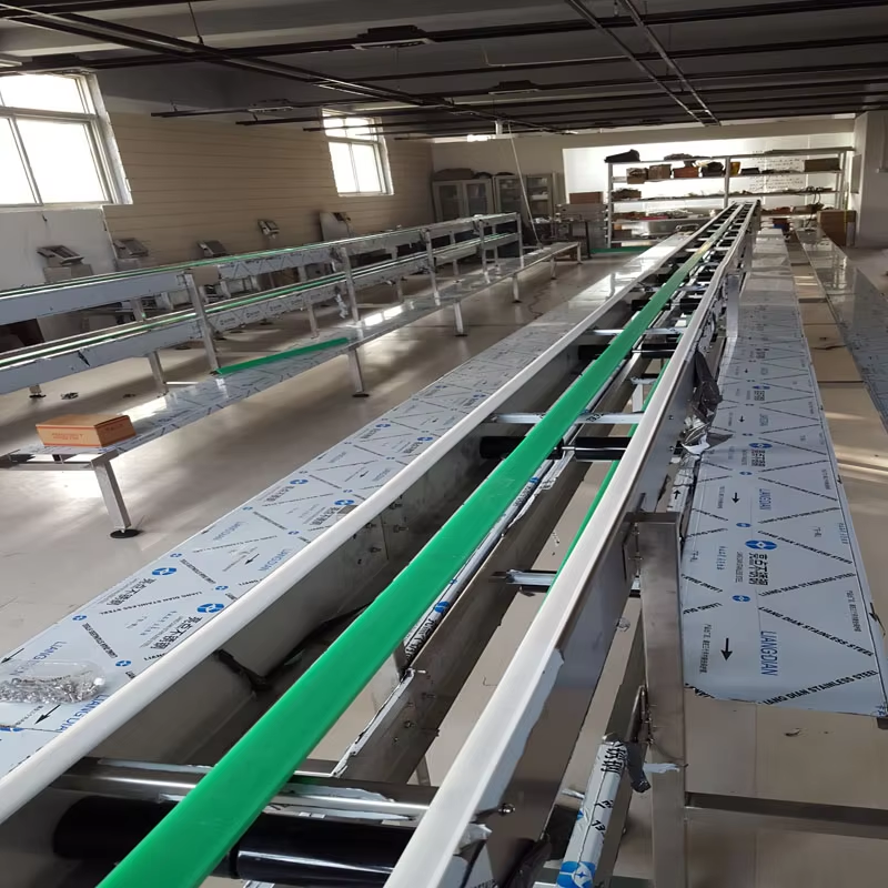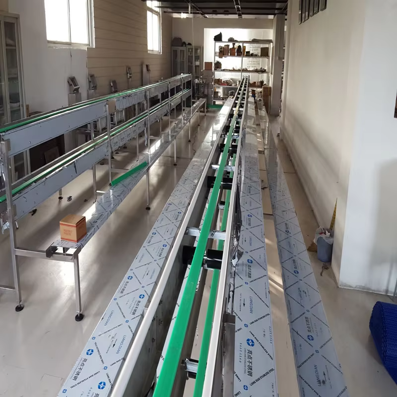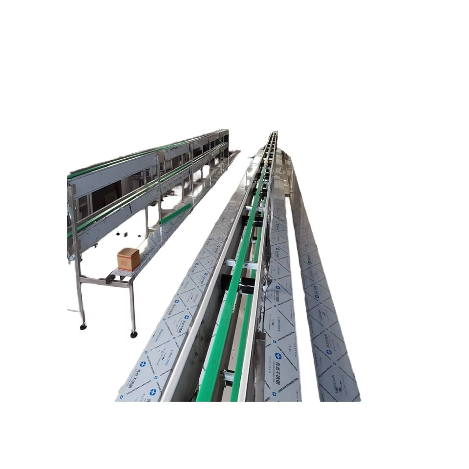 The chain plate conveyor takes the standard flat top chain as the bearing surface and the motor reducer as the power transmission. It runs in the special guide rail. The conveying surface is flat and smooth, and the friction force is small. Materials transition smoothly between conveying lines. According to different process flow, chain plate line is divided into straight line and turning line, and materials are divided into thermoplastic steel and stainless steel. It is suitable for conveying plastic bottles, glass bottles, cans and other packaging materials, but also can convey cartons, bags packaging products, we can make a multi-row one, in such a way that that convey surface is wide and the speed difference is formed so that the plurality of rows become a single row without extrusion, the single row may also become a plurality of rows and travel slowly, so as to realize the storage of materials in the conveying process.