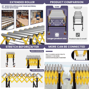 Makes the conveyor roller easy to expand or contract when space is limited. When you after use, conveyor belt can fold away for easy storage until next time.