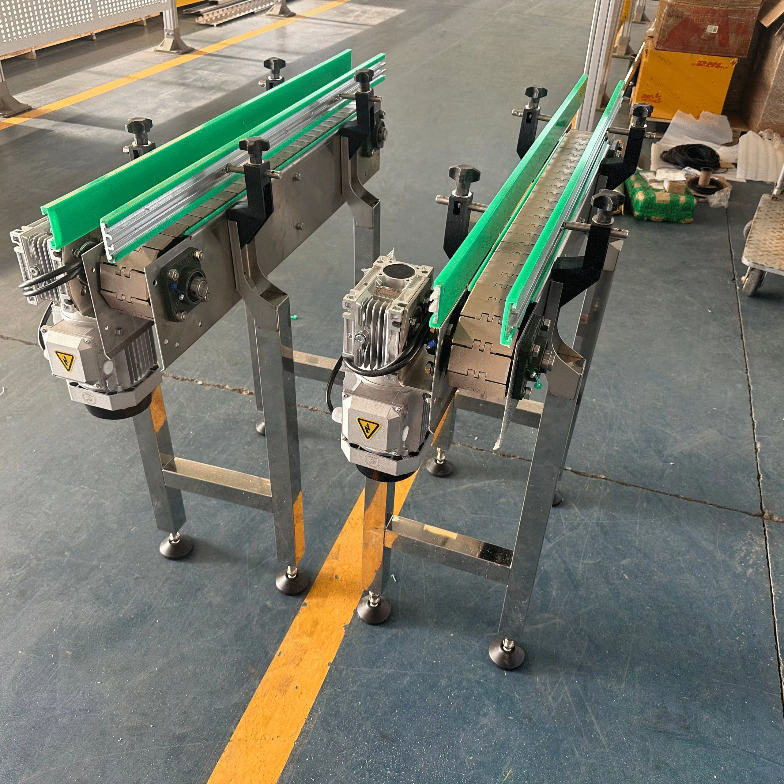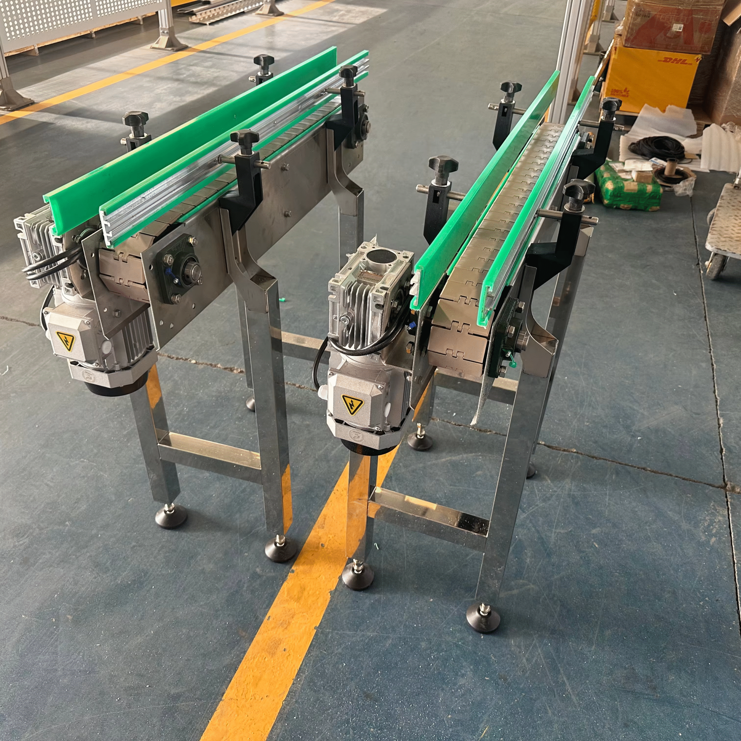 The chain plate conveyor takes the standard flat top chain as the bearing surface and the motor reducer as the power transmission. It runs in the special guide rail. The conveying surface is flat and smooth, and the friction force is small. Materials transition smoothly between conveying lines. According to different process flow, chain plate line is divided into straight line and turning line, and materials are divided into thermoplastic steel and stainless steel. It is suitable for conveying plastic bottles, glass bottles, cans and other packaging materials, but also can convey cartons, bags packaging products, we can make a multi-row one, in such a way that that convey surface is wide and the speed difference is formed so that the plurality of rows become a single row without extrusion, the single row may also become a plurality of rows and travel slowly, so as to realize the storage of materials in the conveying process.