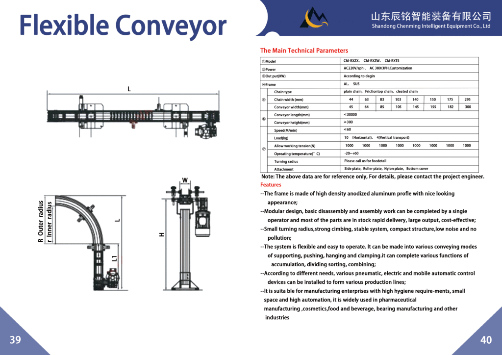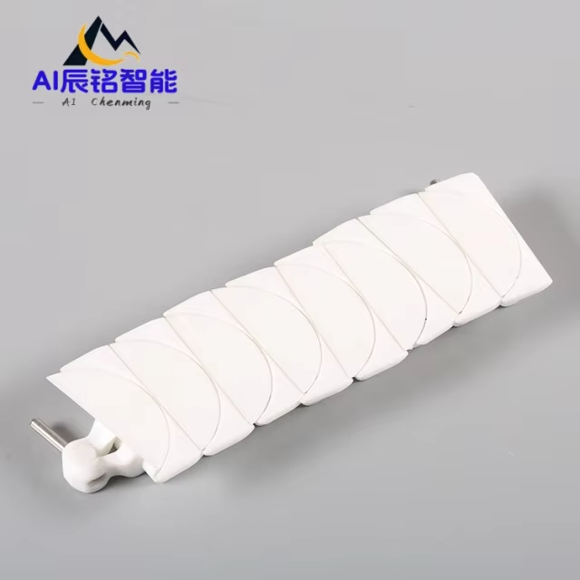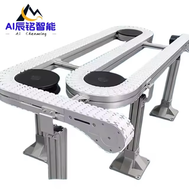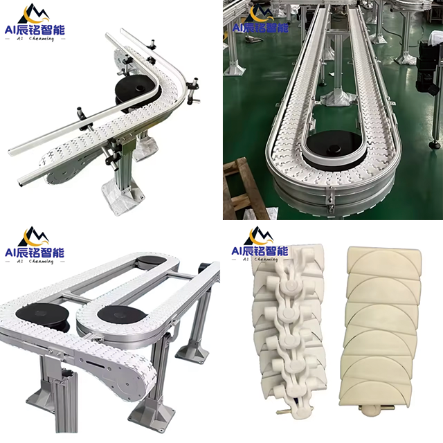 The flexible chain conveyor is further improved on the basis of the traditional chain plate conveyor, so that the operation of the chain plate is qualitatively improved. The machine body is made of standard aluminum profile. All the standard parts are assembled to make the remote rotation of the conveyor more stable and smooth. Conveying form can complete complex three-dimensional layout, can turn, climb, downhill in the same power to complete. Mainly used in daily chemical, pharmaceutical, bearings, roll paper, auto parts processing and other industries.